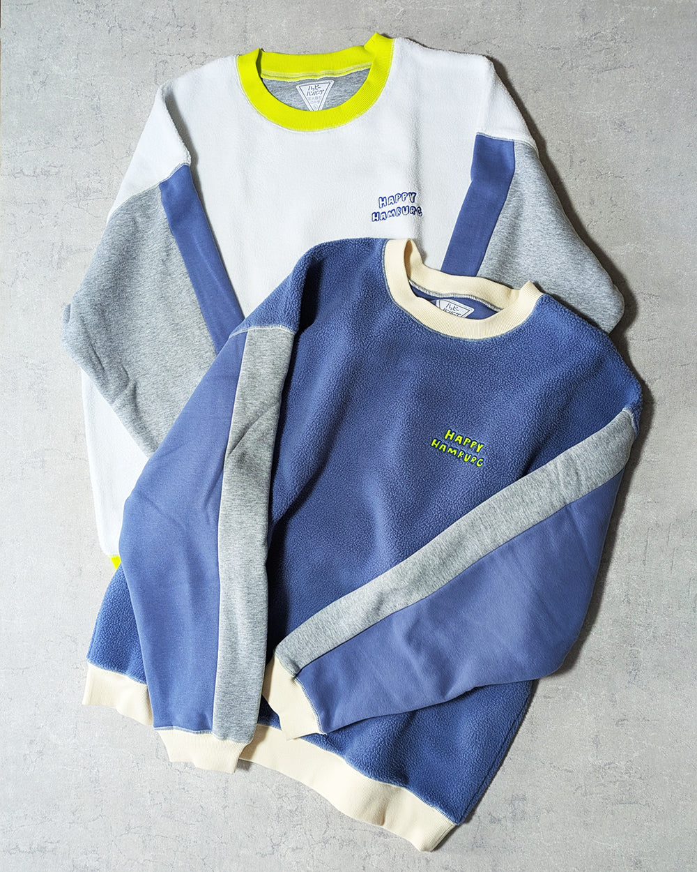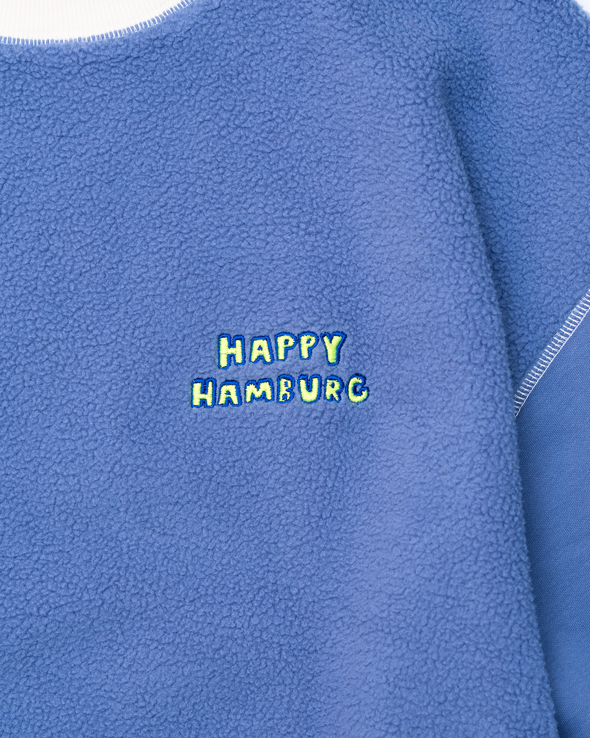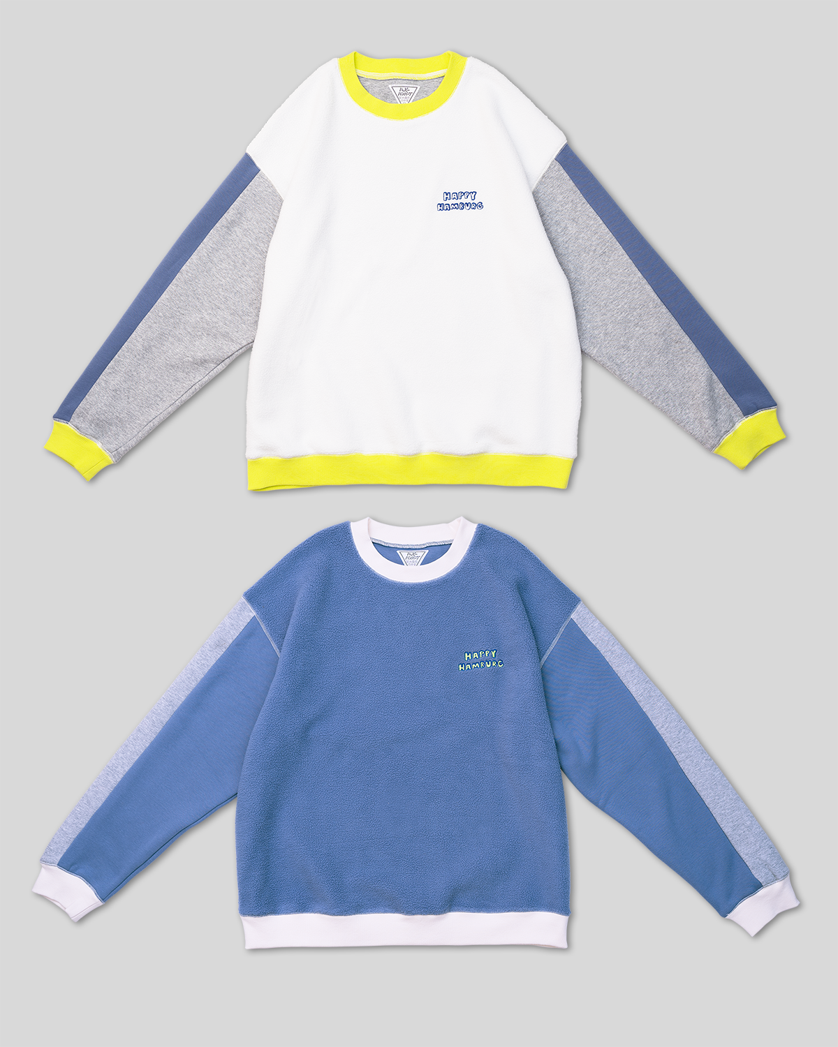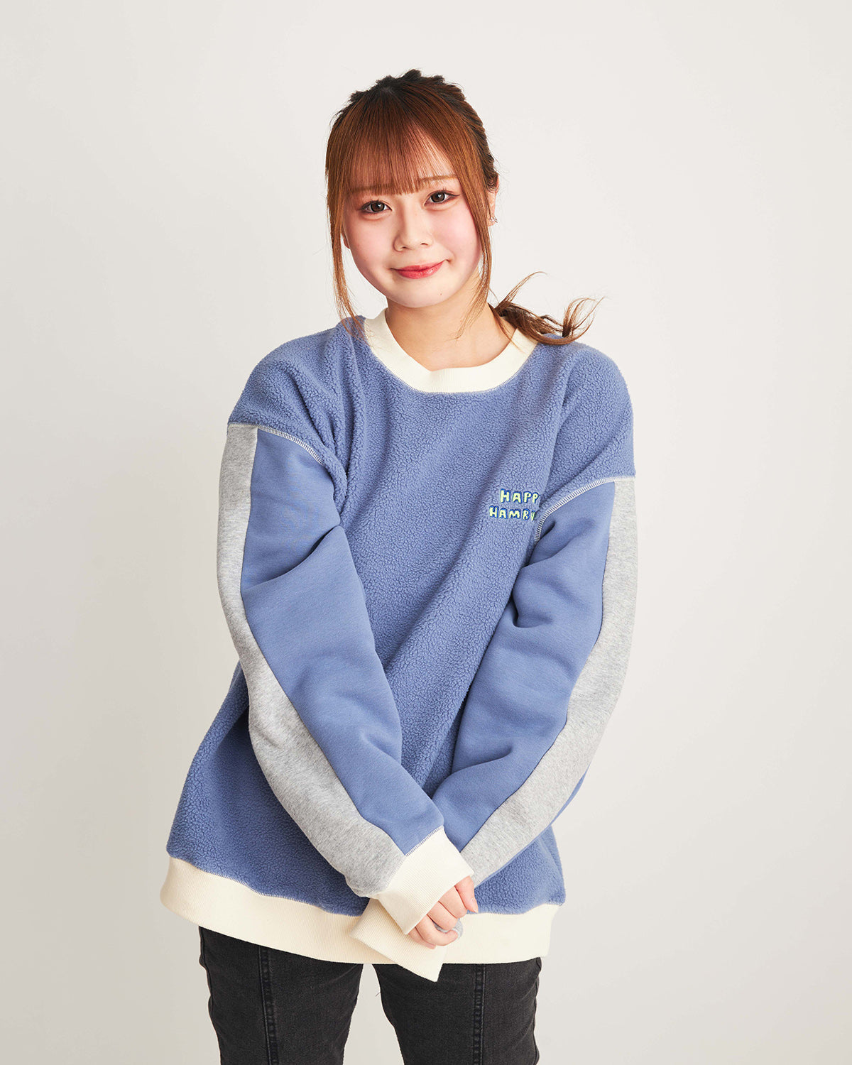 ハピハンらしいカラーブロックのスウェットが今年も登場!今回はモコモコ起毛の裏毛を使用しているので暖か!ホワイトとブルーの2色展開です。