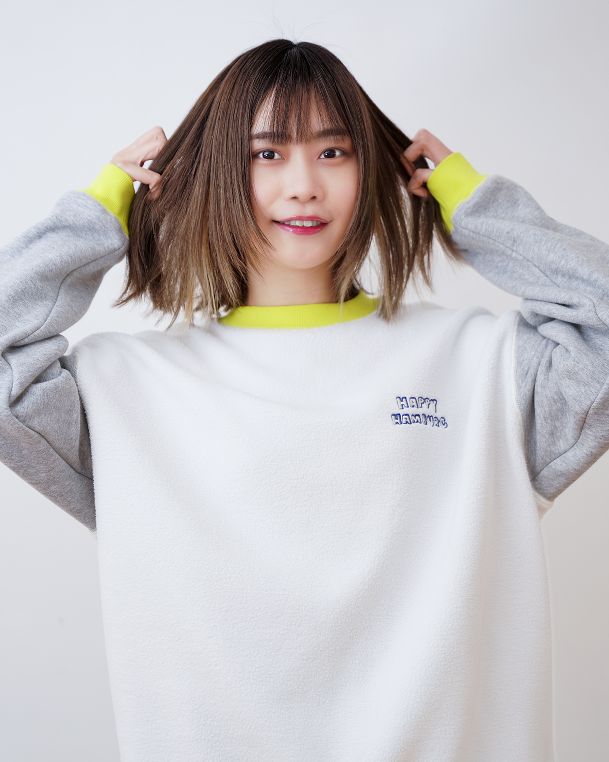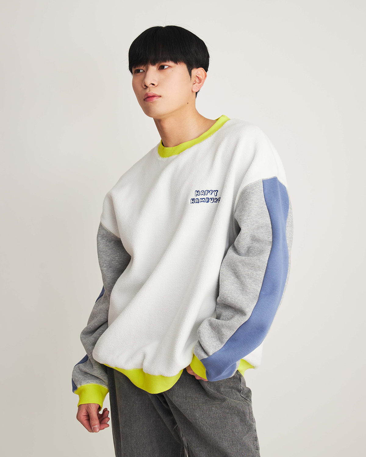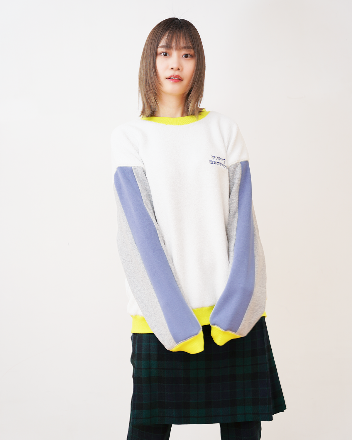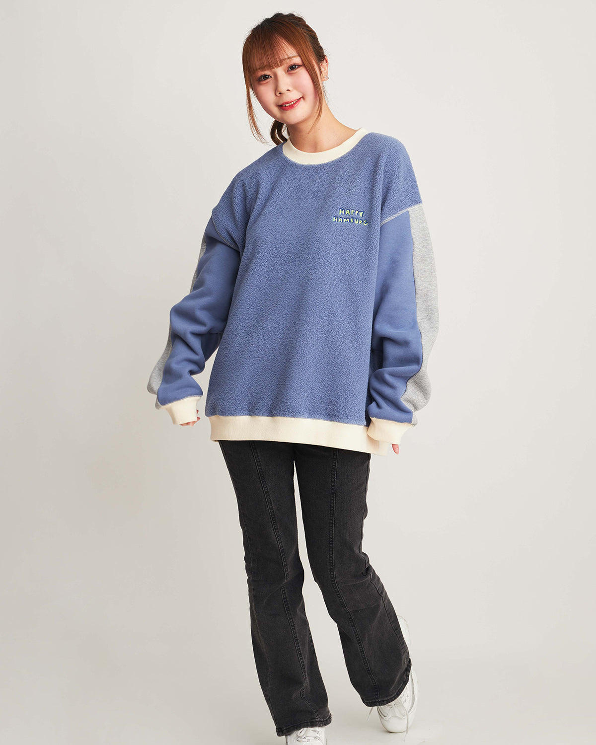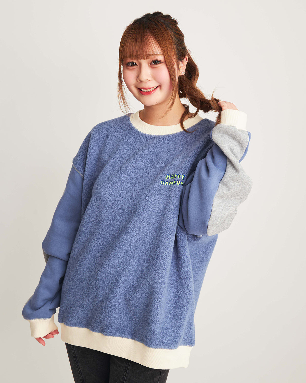 ハピハンらしいカラーブロックのスウェットが今年も登場!今回はモコモコ起毛の裏毛を使用しているので暖か!ホワイトとブルーの2色展開です。