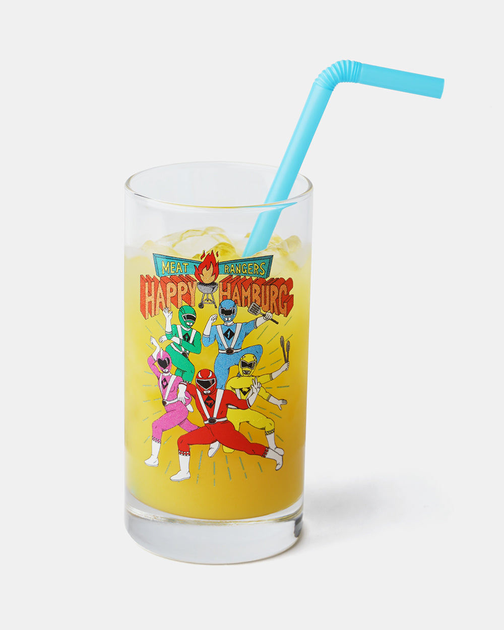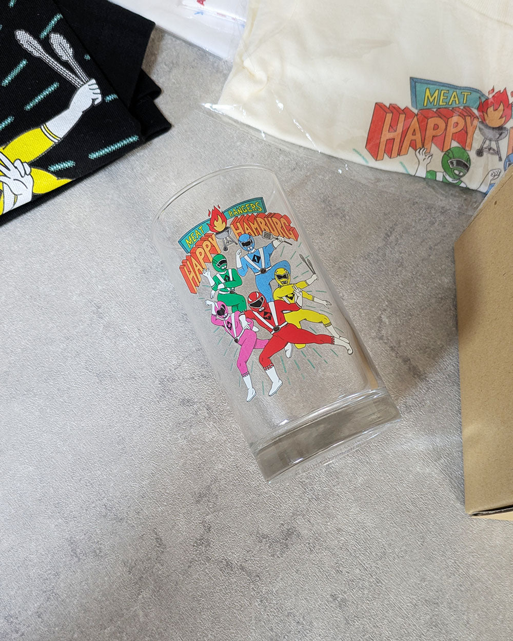 人気の"肉塊戦隊ハッピーハンバーグ"のイラストがプリントされたグラスが出来上がりました。子供の頃の気持ちに戻れるような懐かしいデザインです。